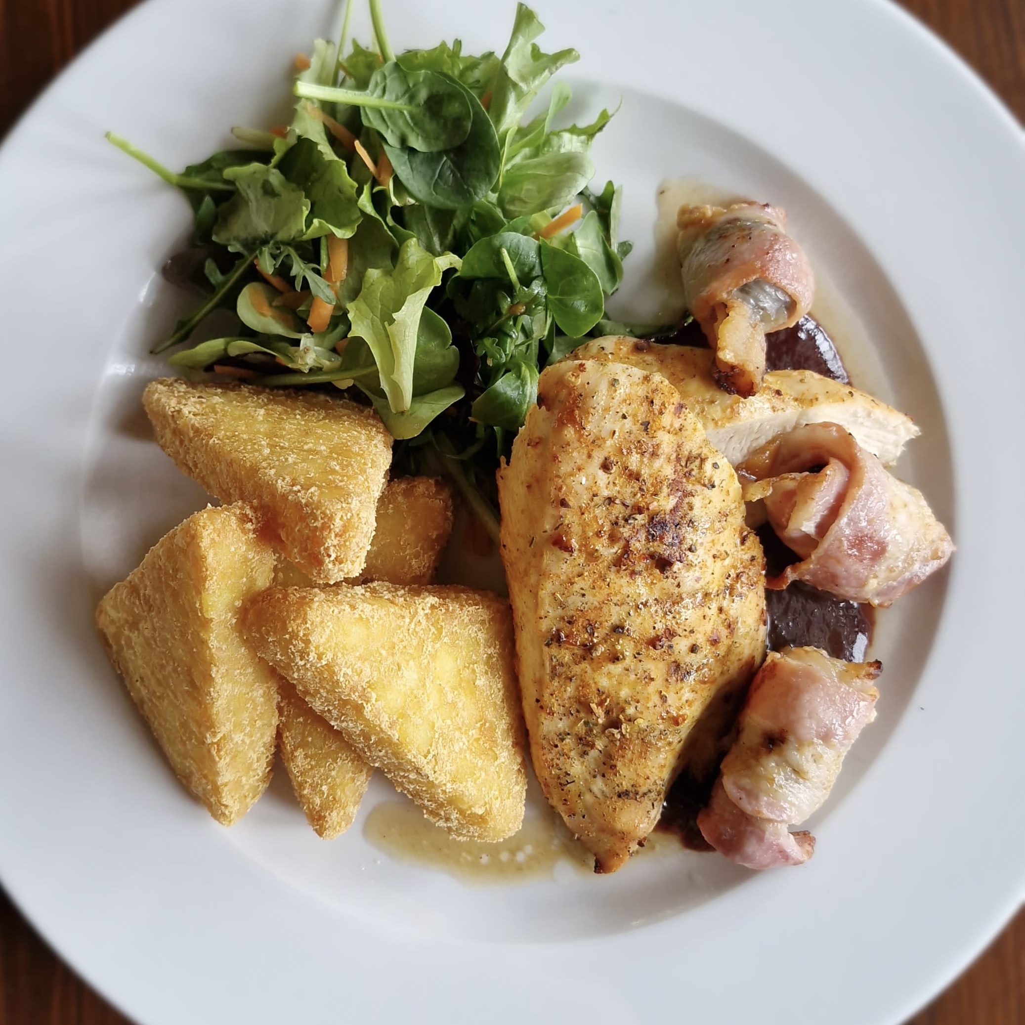 200 g KUŘECÍ STEAK SE ŠVESTKOVOU OMÁČKOU, ŠVESTKY OBALENÉ VE SLANINĚ, BRAMBOROVÉ RÖSTI, SALÁTEK